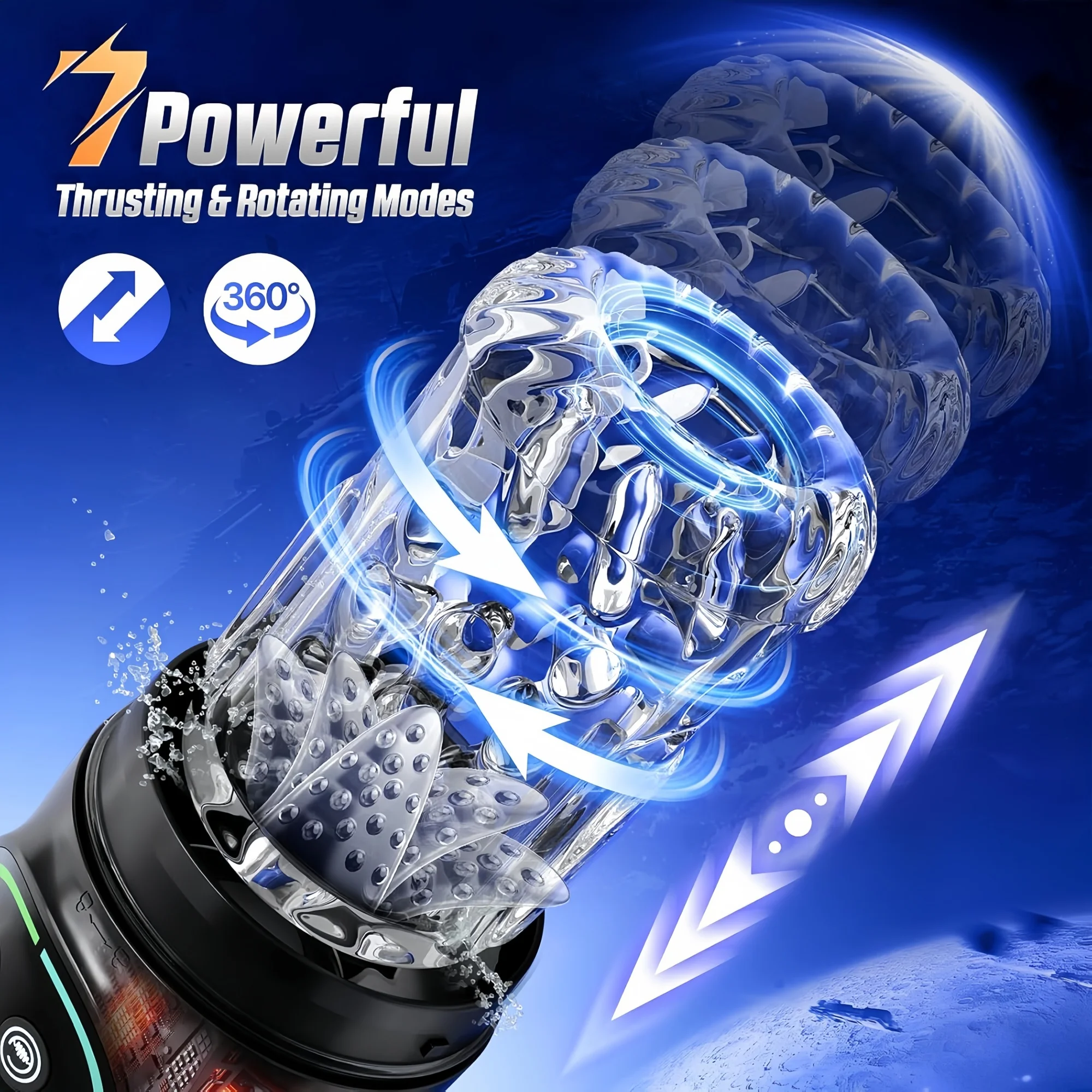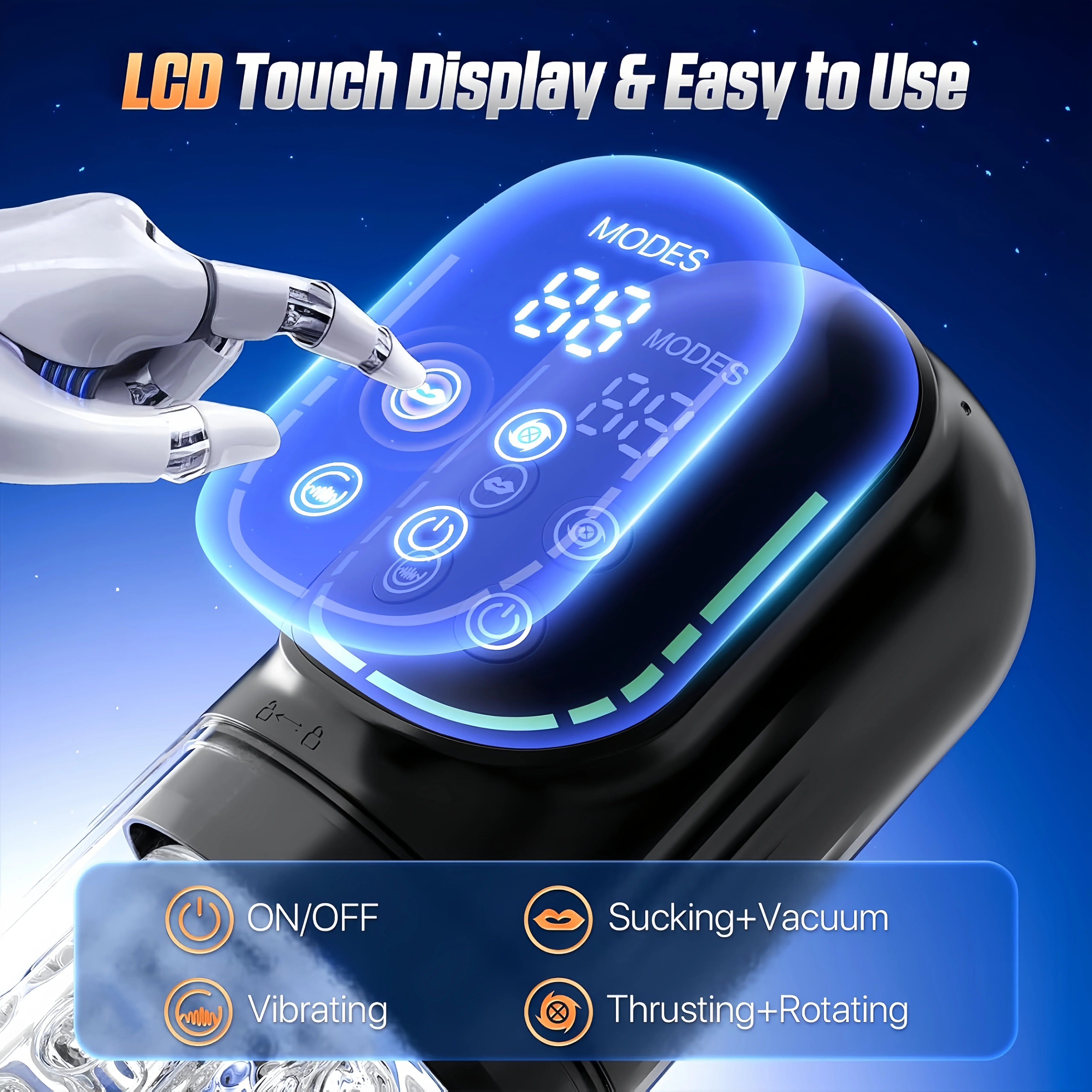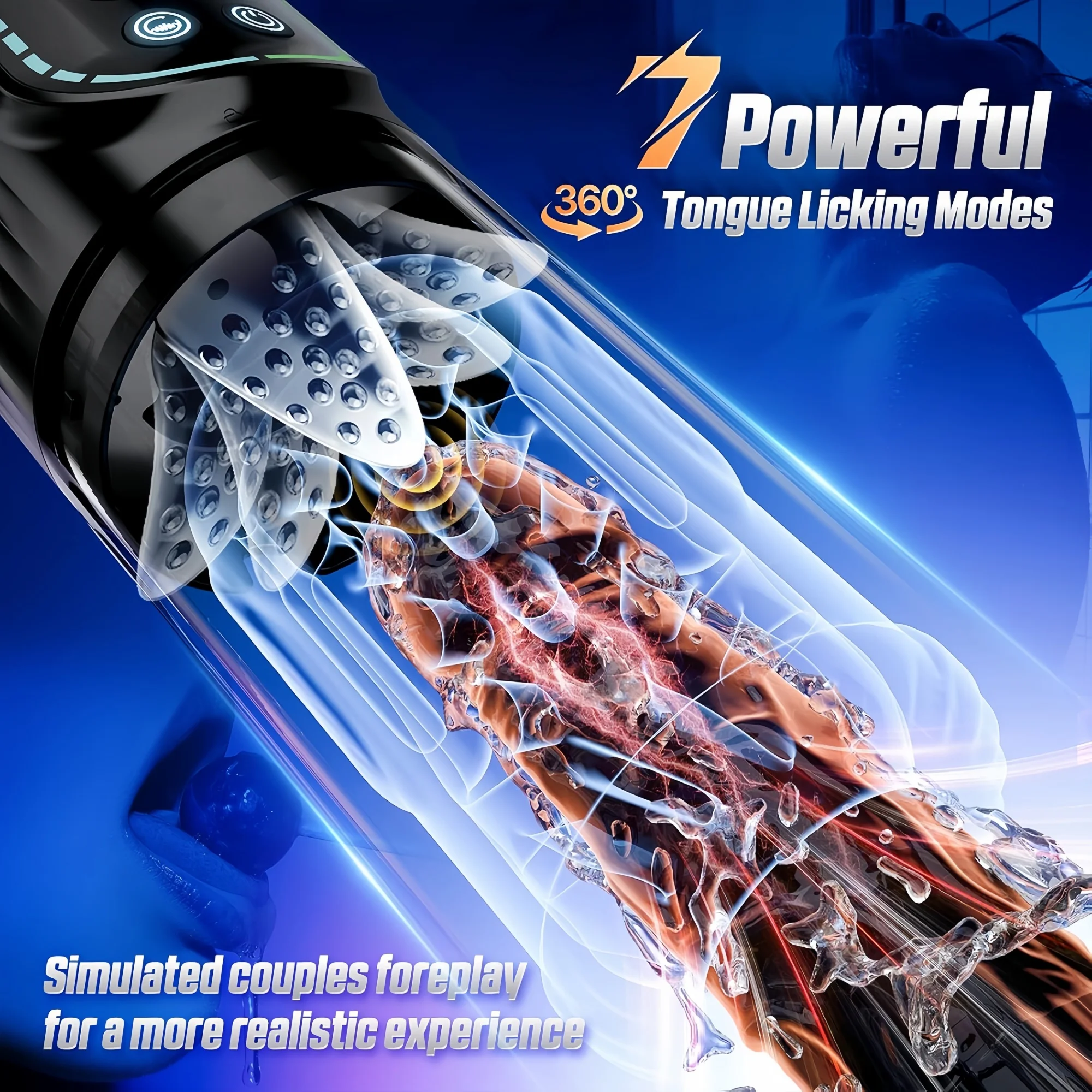 This male sex toy combines 7 thrusting, rotating, and sucking modes with licking for realistic penis stimulation, controlled via LCD screen for tailored pleasure.