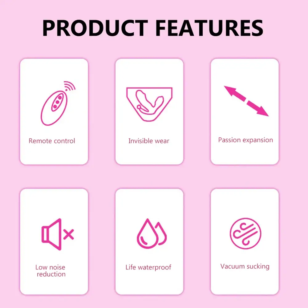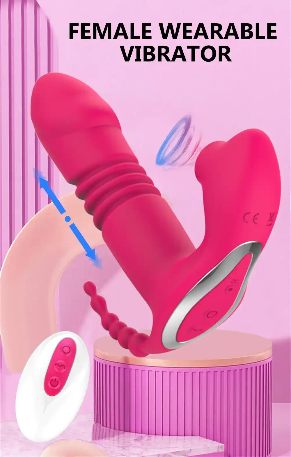 This wearable vibrator combines a sucking clitoral mouth, telescopic G-spot shaft, and anal tickler in one compact U-shape. Slip it inside, position the sucking head over your clit, and control all 12 suction + 12 vibration modes with the wireless remote up to 10 meters away.