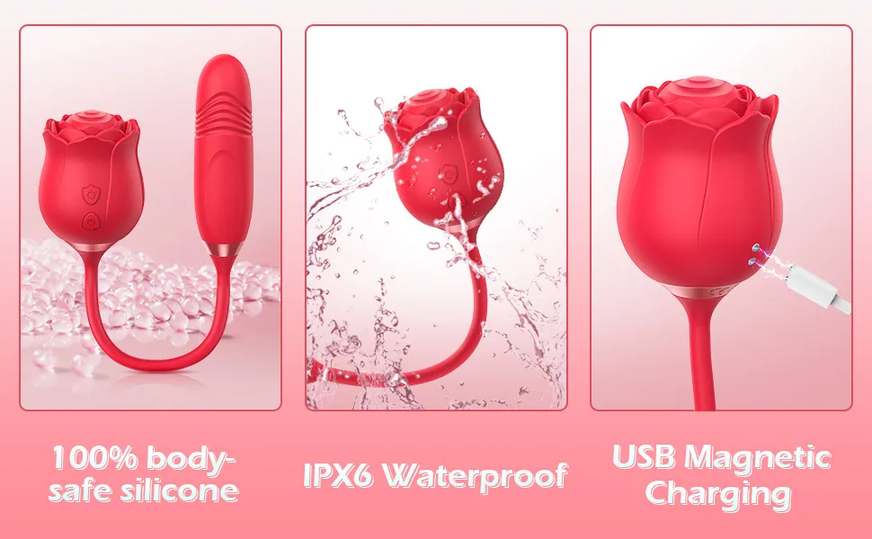 Fully IPX7 waterproof, submerge it in the bath or pool without damage. Clean by rinsing under warm water with mild soap, focusing on the rose petals and thrusting tip; the magnetic USB charger detaches easily. Dry thoroughly before storage to maintain hygiene and longevity for repeated pleasurable sessions.