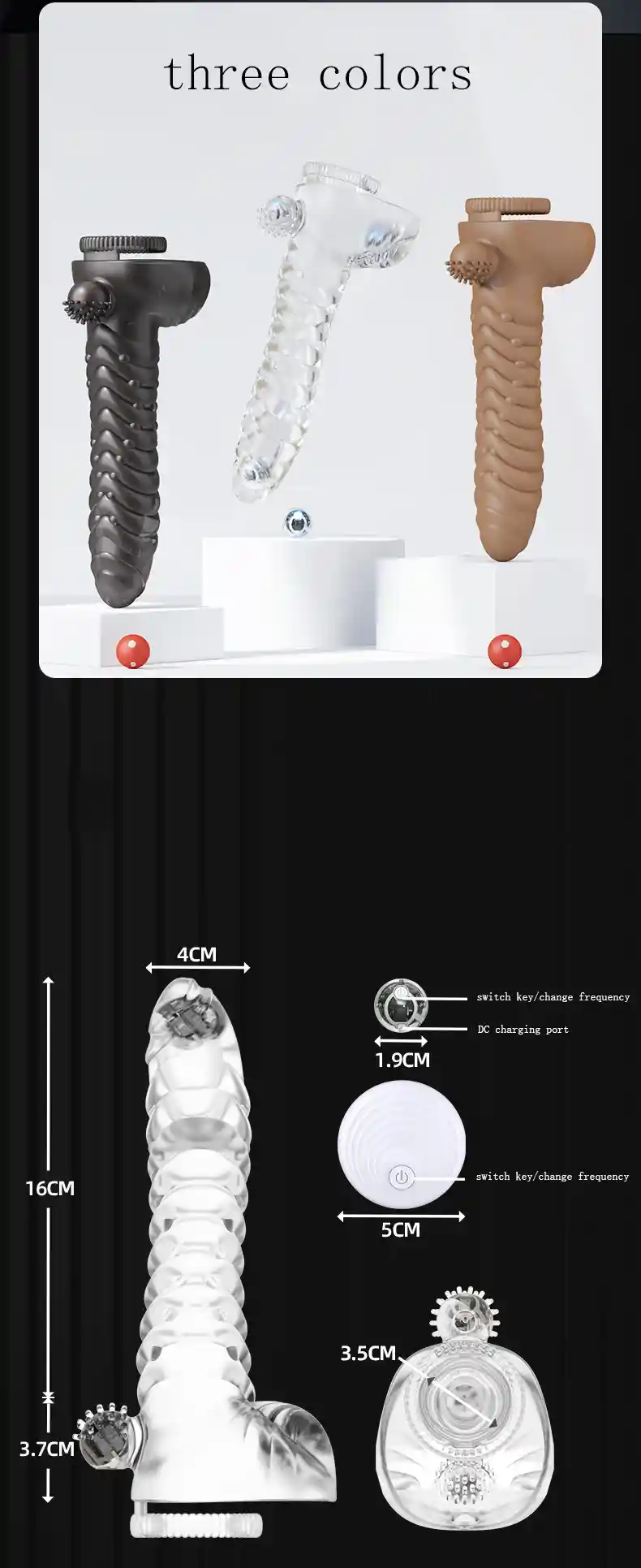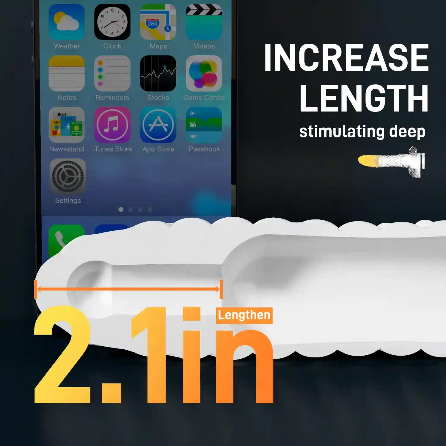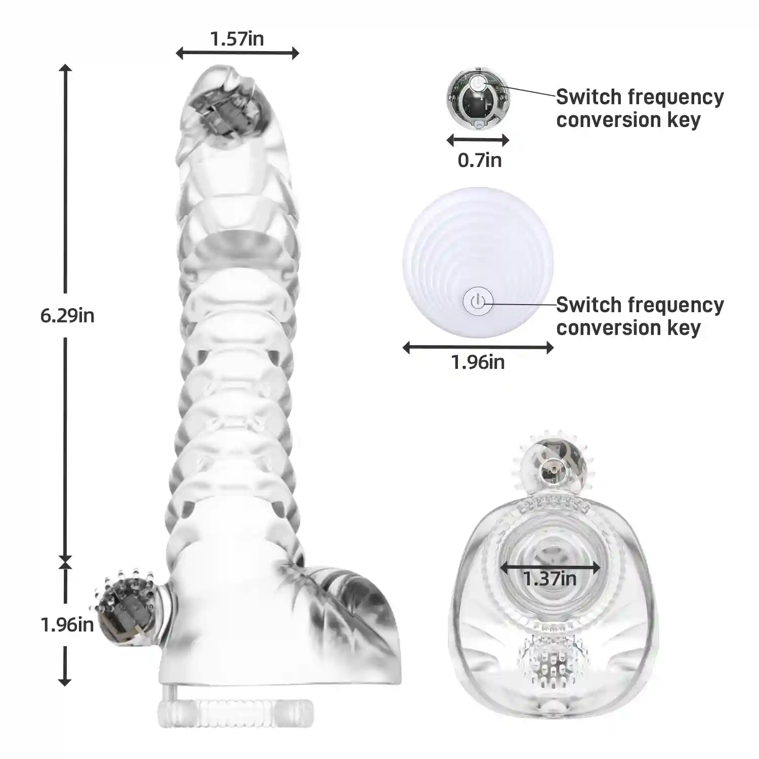 The soft silicone extender adds up to 3 inches in visible length instantly. Thick walls create 20% more girth the moment you slide in. 10 vibration modes make you feel bigger and harder than ever.
