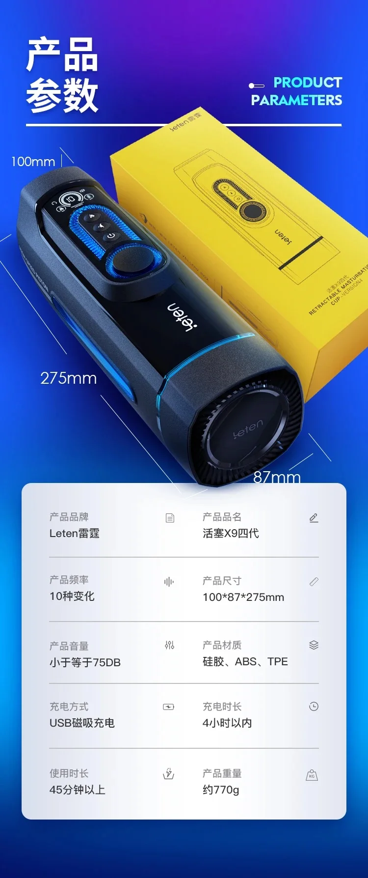 The Leten X9 IV stands out with its automatic rotation, telescopic motion, and heating features, mimicking real intimacy. It offers quadruple piston modes, stepless speed control up to 580 strokes per minute, and a moaning vagina vibrator for an immersive experience. Made from medical-grade silicone, ABS, and TPE, it ensures safety and comfort.