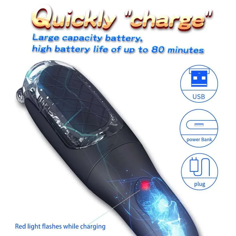 Fully sealed life-waterproof design, wash directly under tap. USB magnetic charging (cable included), 2 hours charge = 70–90 minutes continuous sucking. Red light flashes while charging, turns solid blue when full.