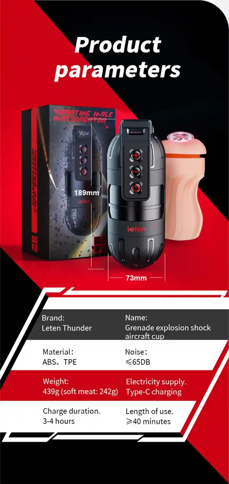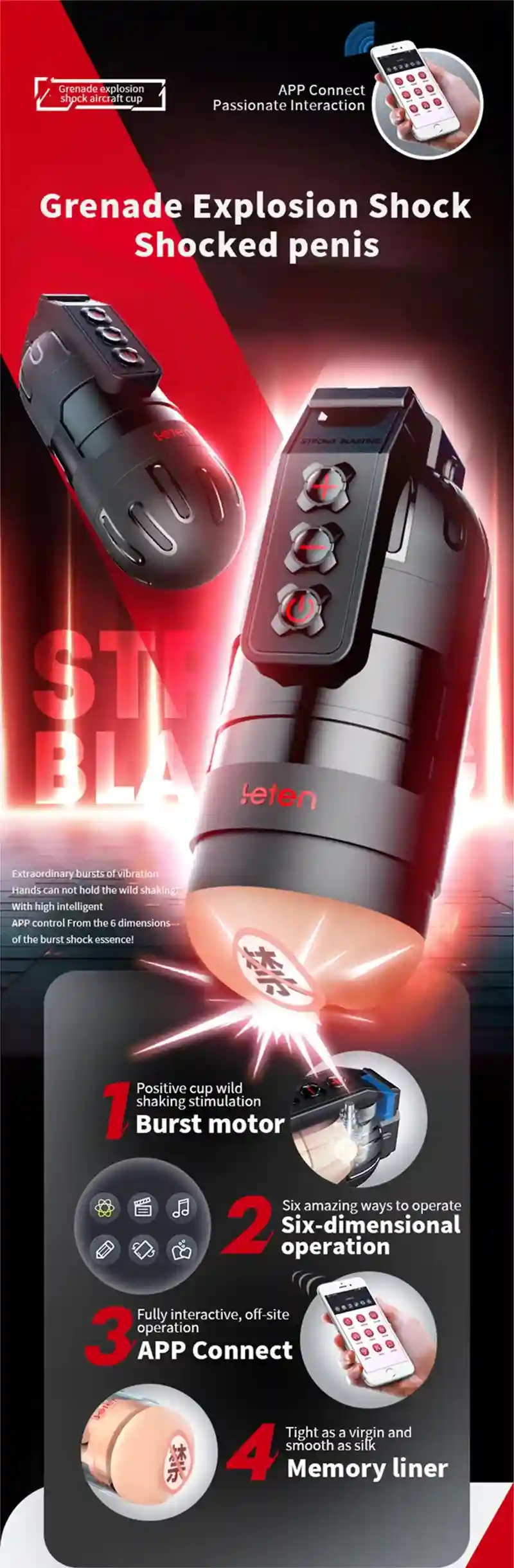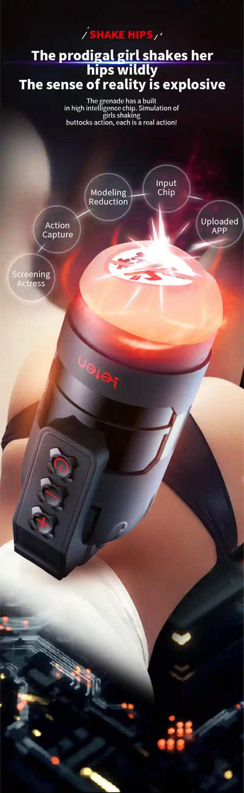Hand-grenade shape with military-grade grip, built-in rechargeable battery, 9-level sucking + vibration controlled by smartphone app anywhere in the world, ultra-tight fleshy silicone sleeve that wraps 360°, one-click orgasm burst mode, and fully waterproof design.