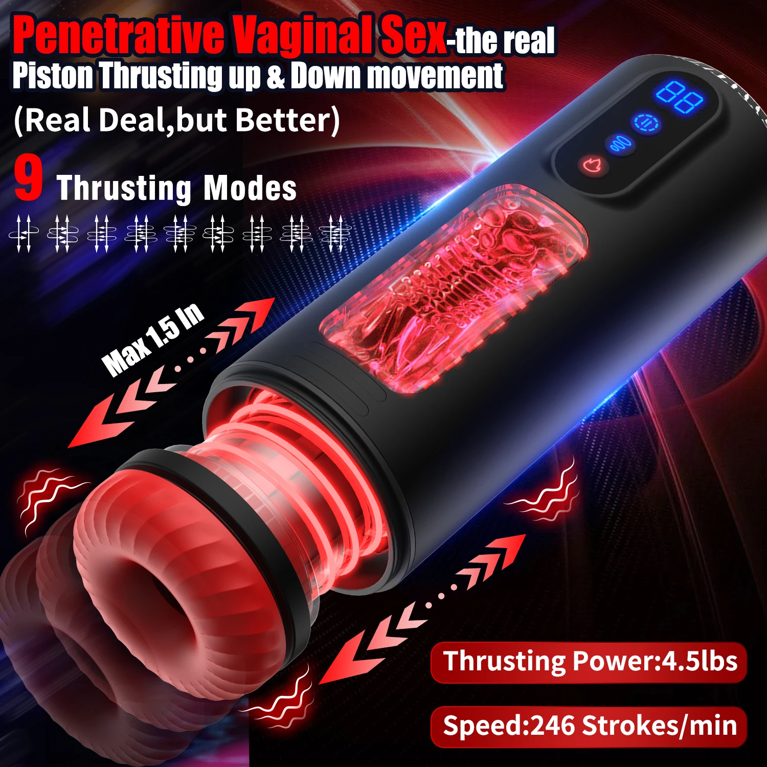 The deep throat sucking in this thrusting penis pump uses piston action and soft sleeve to mimic oral sex, with adjustable heating voice enhancing stimulation for powerful climaxes in adult masturbation machines for men.
