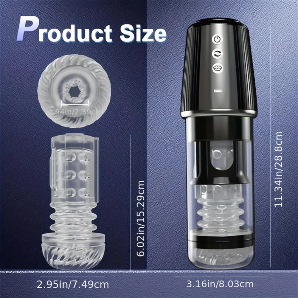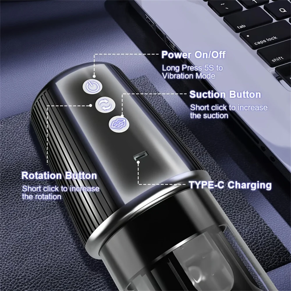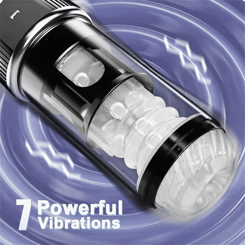This twisting vibrator male masturbator offers 7 vibration modes, 5 squeezing rotations, and 5 sucking frequencies via three motors, allowing customizable penetration and stimulation for intense pleasure in sex toys for men.