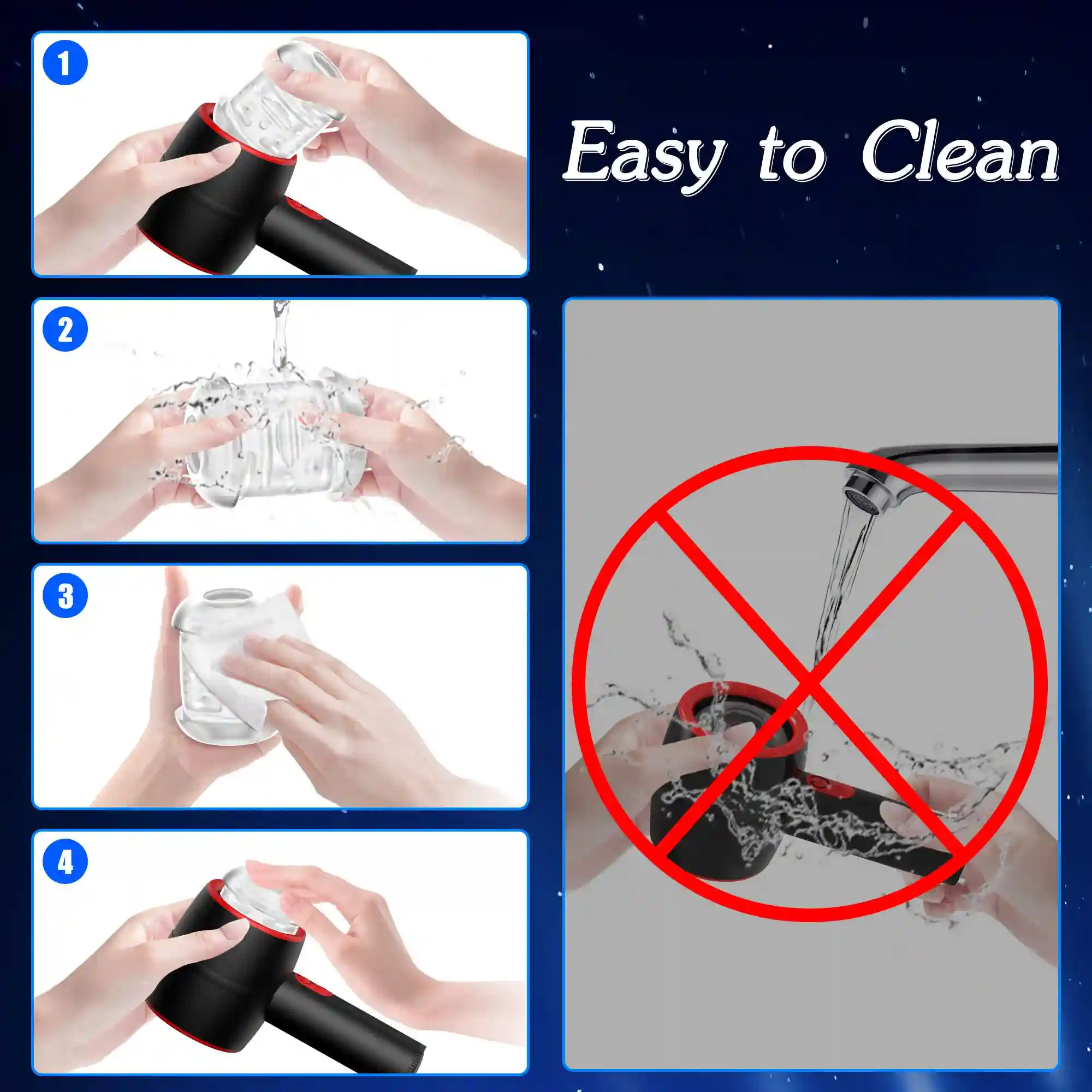 Cleaning is incredibly easy, it has a detachable inner sleeve, which can be easily taken out from the cup to clean up under the tap. After washing and drying you can put it back into the masturbator with ease.