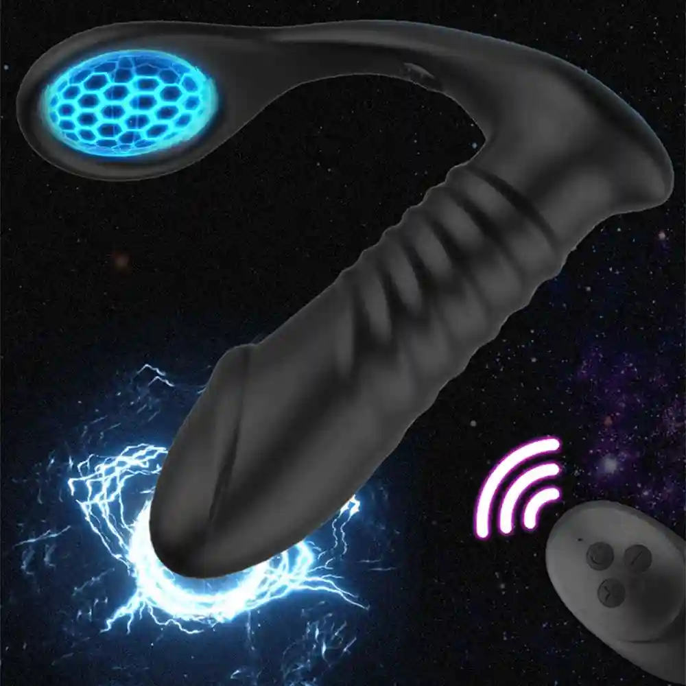 How Far Does the Telescopic Thrusting Butt Plug Actually Extend? The head thrusts 1.5 cm back and forth at 7 different speeds while 10 vibration patterns hit your prostate and perineum at the same time for full dual stimulation.